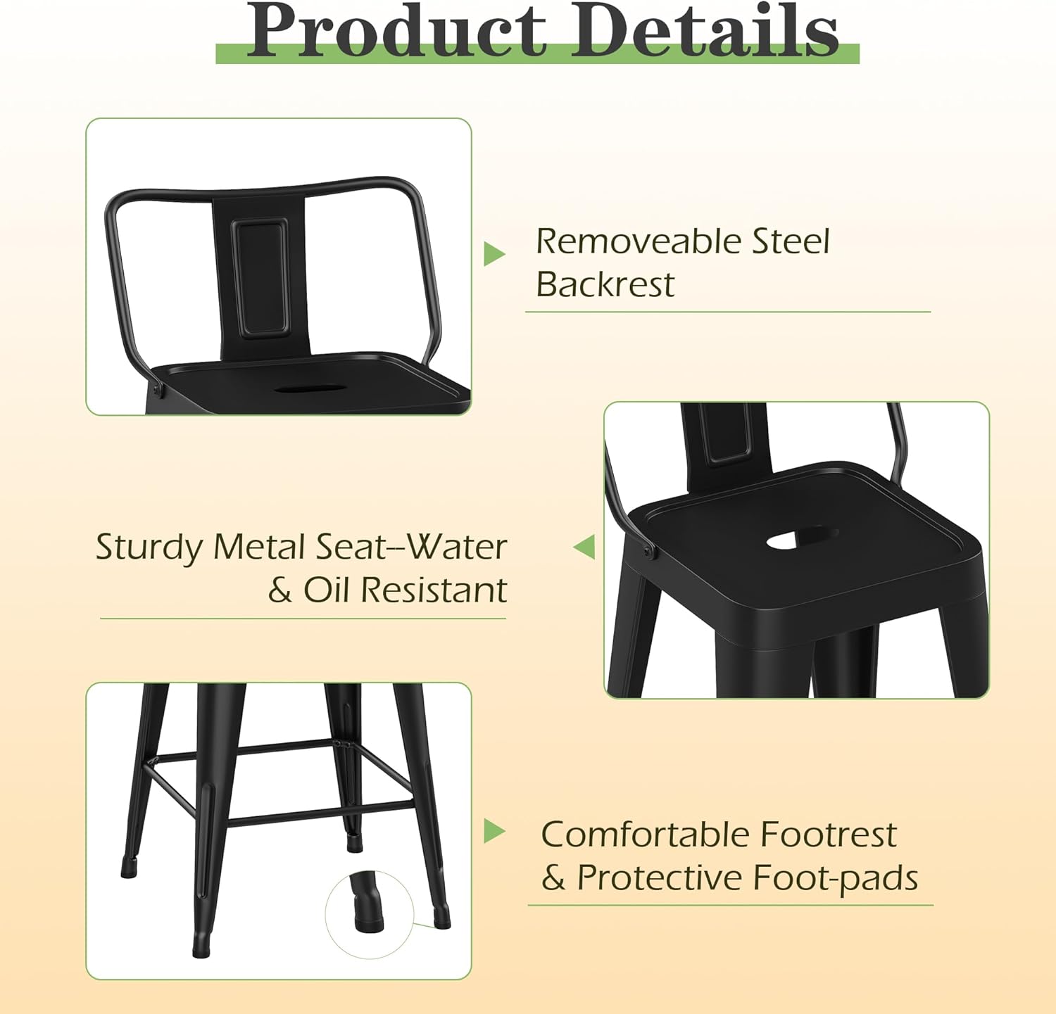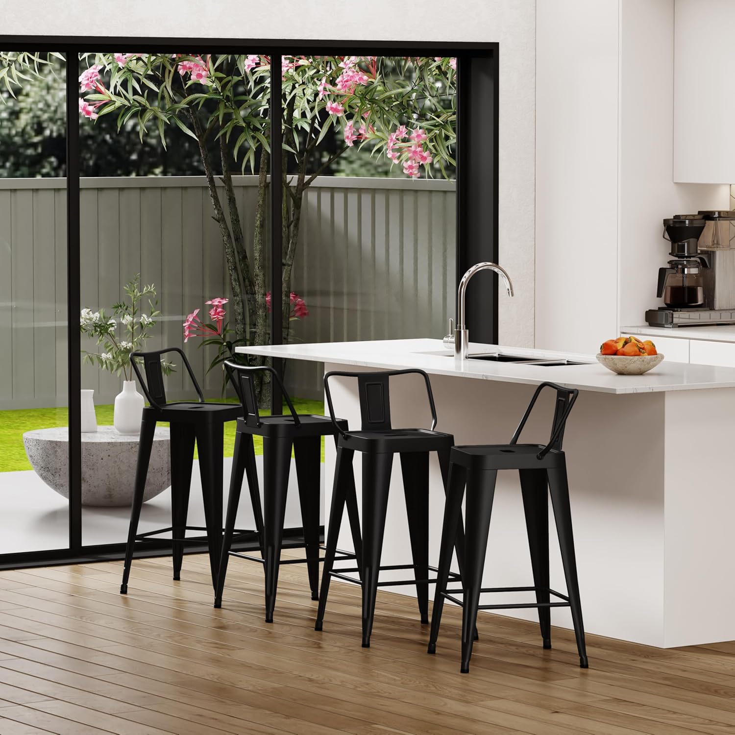 Metal Bar Stools Set of 4 Barstools Indoor/Outdoor Counter Height Bar Stools Bar Chairswith Back Counter Height for Kitchen Island Dining Room (Black, 26inch)