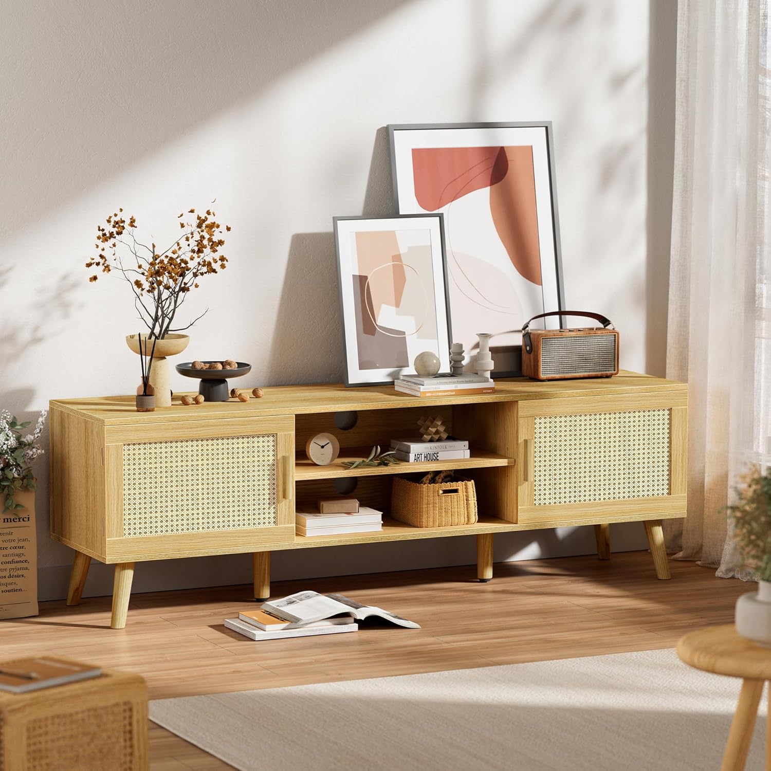 SUPERJARE Boho TV Stand for 65 Inch TV, Entertainment Center with Adjustable Shelf, Rattan TV Console with 2 Cabinets, Media Console, Solid Wood Feet, 4 Cord Holes, for Living Room - Natural