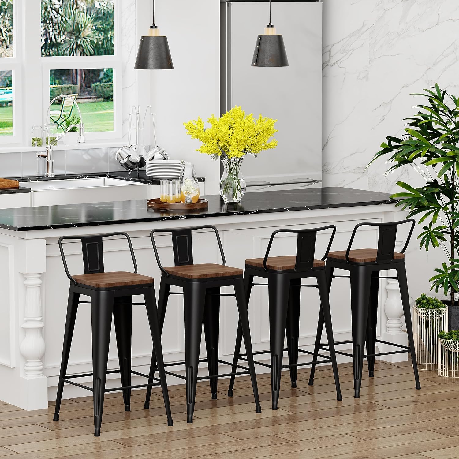 Yongchuang 24" Metal Barstools Set of 4 Counter Bar Stools with Wood Top Low Back Matte Black